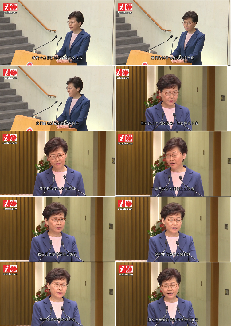 行政長官林鄭月娥宣布,《逃犯條例》修訂草案壽終正寢,她指這說法比撤回更斬釘截鐵,又承認修例工作完全失敗,願意與學生在無前設下公開對話。