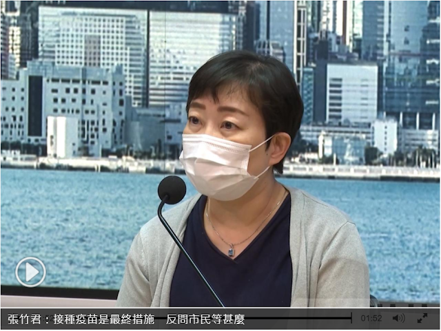 張竹君說,自己在4月前已接種復必泰疫苗,現時已經有安全及有效的疫苗供港,英國、美國及以色列等國家的疫苗接種情況較好,疫情明顯有改善。香港如果不再加快接種的步伐,未能建立保護屏障,之後一放鬆社交距離措施或者一通關,好容易再引發疫情,呼籲市民踴躍接種疫苗,令社會回復正常生活。