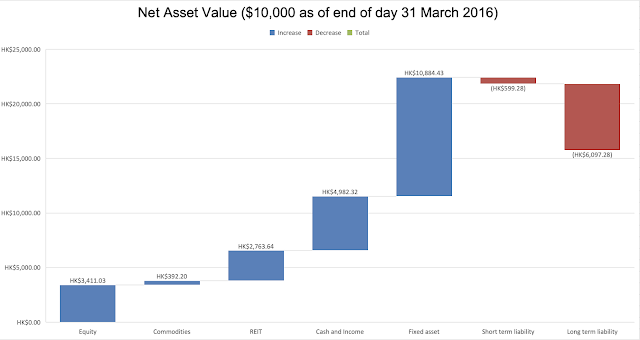 魔術師近月趁別人恐懼我貪婪,開始分段買入,算是撈到少少底,但屋企住宅價格估價跌幅卻甚大,帳面又少咗幾個巴仙。受樓價下跌拖累,股市債市升幅被抵消,本月資產淨值(身家)埋單每單位收報$15,737,較上月微升0.80%,淨流動資產較上月卻較上月大升18.84%(較2016年3月31日基數升66.58%):